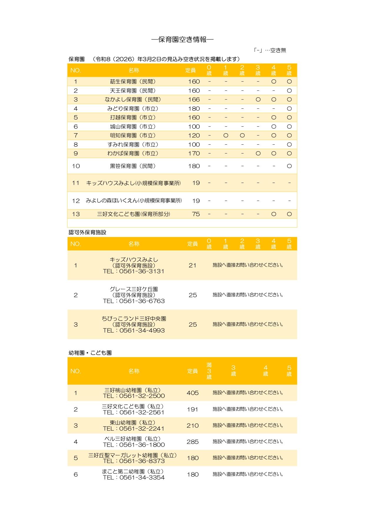・令和8(2026)年3月2日見込みの空き状況です。空き状況は変動します。(空いている園への入園を保証するものではありません。)