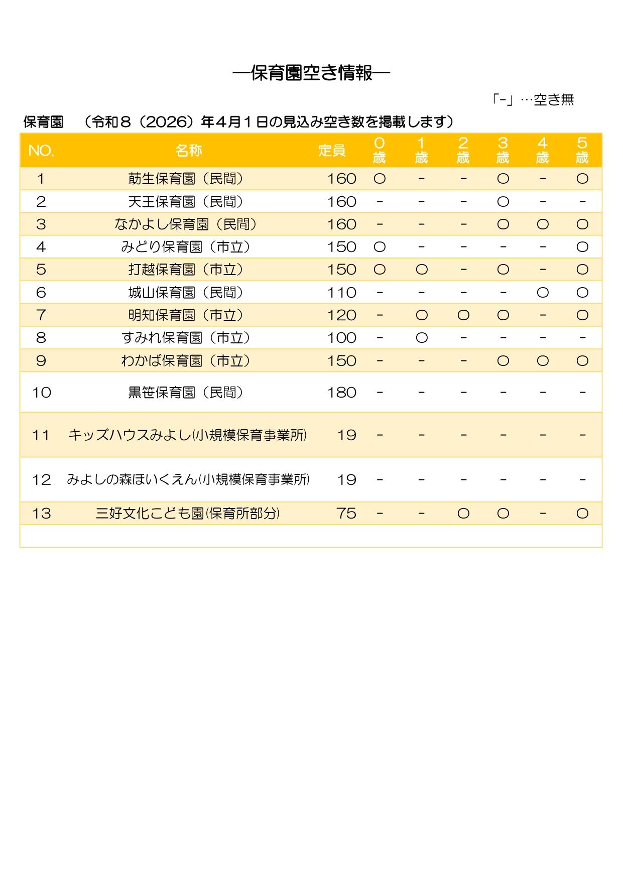 ・令和8(2026)年度保育園・小規模保育事業所の入園受付、一次受付終了時点の空き状況です。空き状況は変動します。(空いている園への入園を保証するものではありません。)